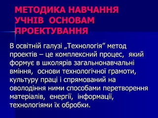 МЕТОДИКА НАВЧАННЯ УЧНІВ ОСНОВАМ ПРОЕКТУВАННЯ В освітній галузі „Технологія” метод проектів – це комплексний процес, який формує в школярів загальнонавчальні вміння, основи технологічної грамоти, культуру праці і спрямований на оволодіння ними способами перетворення матеріалів, енергії, інформації, технологіями їх обробки.