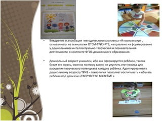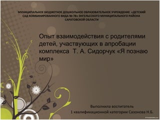 Документ описывает опыт воспитателя по взаимодействию с родителями в рамках апробации методического комплекса «Я познаю мир», направленного на развитие интеллектуально-творческих навыков у детей дошкольного возраста. В процессе работы были организованы родительские собрания, консультации и игровые тренинги для повышения педагогической культуры родителей и включения их в образовательный процесс. Результаты взаимодействия показали рост интереса родителей и их активное участие в обучении и развитии детей.