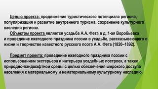 Проект 'Праздник поэзии в усадьбе А.А. Фета' направлен на популяризацию внутреннего туризма и сохранение культурного наследия региона через ежегодное проведение праздника. Мероприятие проходит в усадьбе А.А. Фета и знакомит посетителей с жизнью и творчеством поэта. Проект обеспечивает доступ к материальному и нематериальному культурному наследию на основе уникальной природно-ландшафтной среды усадьбы.