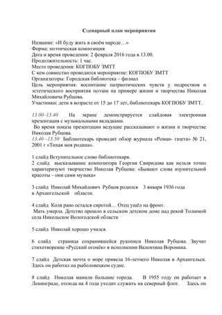 Документ представляет собой методическую разработку поэтической композиции, посвященной 80-летию Николая Рубцова, с целью воспитания патриотических чувств у подростков. Мероприятие включает презентацию о жизни и творчестве поэта, а также обзоры его стихотворений и песен. Участие принимают дети 15-17 лет и библиотекари, а презентация обязательно заканчивается отражением значимости наследия Рубцова в русской литературе.