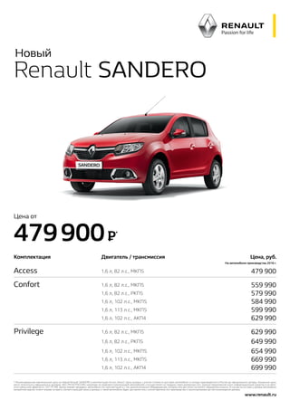 Документ представляет собой таблицу с ценами и характеристиками автомобилей Renault Sandero 2016 года. Указаны различные комплектации, стоимость и оборудование моделей с разными двигателями и трансмиссиями. Также содержатся технические спецификации, рекомендации по дилерам и условия продажи.
