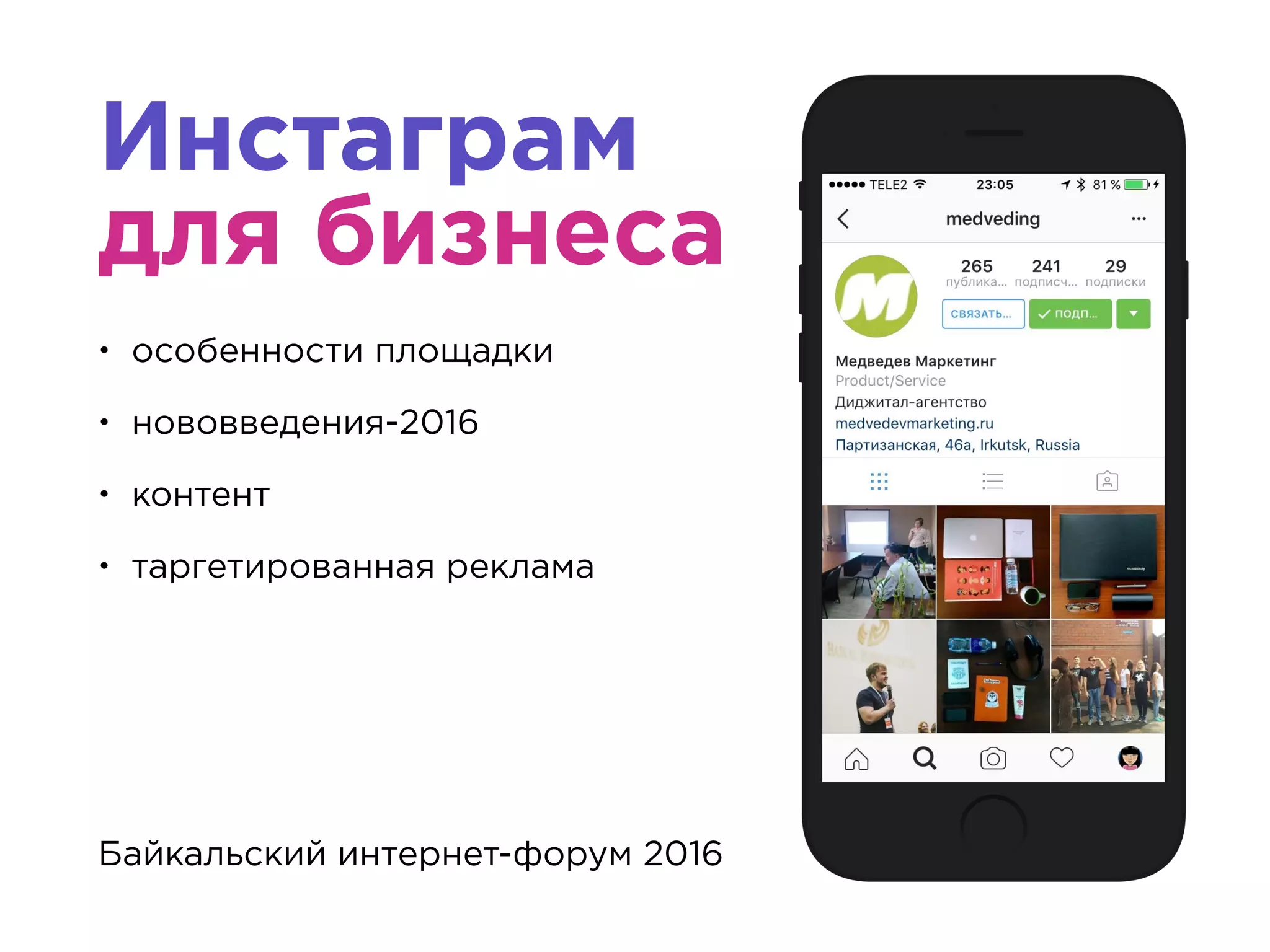 Документ обсуждает использование Instagram для бизнеса, включая ключевые характеристики и нововведения 2016 года, такие как поддержка нескольких аккаунтов и обновленный поиск. Он также подчеркивает изменения в алгоритме ленты и новшества, помогающие вовлекать подписчиков. В документе представлены советы по контенту и рекламным стратегиям.