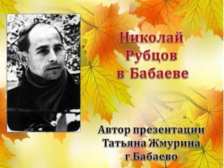 Документ содержит воспоминания о жизни и творчестве поэта Николая Рубцова, его встречах с друзьями и коллегами в Бабаеве в 1960-х годах. Приводятся подробные подробности его необычных визитов, общения и стихи, написанные в этом городе. Бабаевцы продолжают сохранять память о поэте, организуя литературные вечера и конкурсы, посвященные его творчеству.