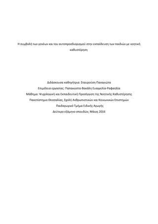 Η παρούσα εργασία εκπονήθηκε στα πλαίσια του μαθήματος “Ψυχολογική και Εκπαιδευτική Προσέγγιση της Νοητικής Καθυστέρησης” και εστιάζει στο ρόλο των γονέων των παιδιών με νοητική καθυστέρηση και της έννοιας του αυτοπροσδιορισμού στην εκπαίδευση των τελευταίων.