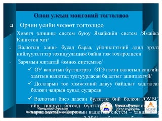 ýðýëò íèéë¿¿ëýëòýýð çîõèöóóëàõã¿é òºâ áàíê ò¿¿íèéã çîðèóäààð õàòóó çîõèöóóëíà. Òºðººñ âàëþòûí õàíøèéã çîõèöóóлах хэлбэр – “àëòàí ñòàíäàðò” Âàëþòûí õàíøûã òîãòìîë áàðих: Тºâ áàíêàíä àëòíû áîëîí ãàäààä âàëþòûí õàíãàëòòàé õýìæýýíèé íººöòýé áàéõ: Сөрөг тал: Хóäàëäààíû áàëàíñûí àëäàãäàë óäààí õóãàöààãààð ¿ðãýëæëýõýä òºð ººðèéí âàëþòûí íººöèéã áàðæ, öààøäûí àëäàãäëûã íºõºæ ÷àäàõã¿éä õ¿ð÷, âàëþòûí õàíøèéã öààøèä òîãòìîë ò¿âøèíä áàðüæ áàéõ áîëîìæã¿é Давах арга зам: Óëñ îðîí ººðèéí âàëþòûí íººöºº èõ õýìæýýãýýð àëäàõàä õ¿ðâýë âàëþòûí õàíøèéã ÷ºëººëºõ áóþó òîäîðõîé õÿíàëòòàéãààð òºâ áàíêíààñ íýìýãä¿¿ëэх.