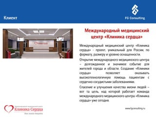 Кейс по развитию компетенций руководителей Международного медицинского центра "Клиника сердца". Управленческое обучение проводил бизнес-тренер проекта и руководитель компании FG Consulting Макаров Антон. Обучение проводится по следующим темам: командообразование, клиентоориентированность, адаптивность к переменам, управление изменениями. Из кейса Вы сможете подробнее узнать о проекте.