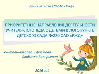 Документ описывает работу учителя-логопеда Людмилы Валерьевны Ефремовой в детском саду №220 ОАО 'РЖД' в 2016-2017 учебном году, где проводятся занятия для коррекции речевых нарушений у 32 детей. В документе изложены методы работы логопеда, диагностика и создание документов для ПМПк, а также направления логопедической деятельности по улучшению звукопроизношения и фонематического восприятия у детей. Указаны также график занятий, консалтинг для родителей и необходимая информация для успешного обучения и развития речи детей с нарушениям.