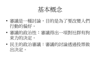 本文探讨了审议民主的核心概念,包括审议的政治性、投票过程中的偏好变化以及审议可能导致的信念错误。它指出,审议可能使个体接受不符合自身最佳利益的信念,并深入分析了投票与信念之间的关系及其导致的双重困境。最后,文章总结了审议过程中的不平等性和信息处理能力的差异如何影响民主决策。