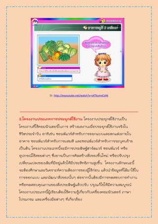 Cr. http://exyoutube.net/watch?v=vXTkumxCsHk ________________________________________________________ 2.โครงงานประเภทการประยุกต์ใช้งาน โครงงานประยุกต์ใช้งานเป็น โครงงานที่ใช้คอมพิวเตอร์ในการ