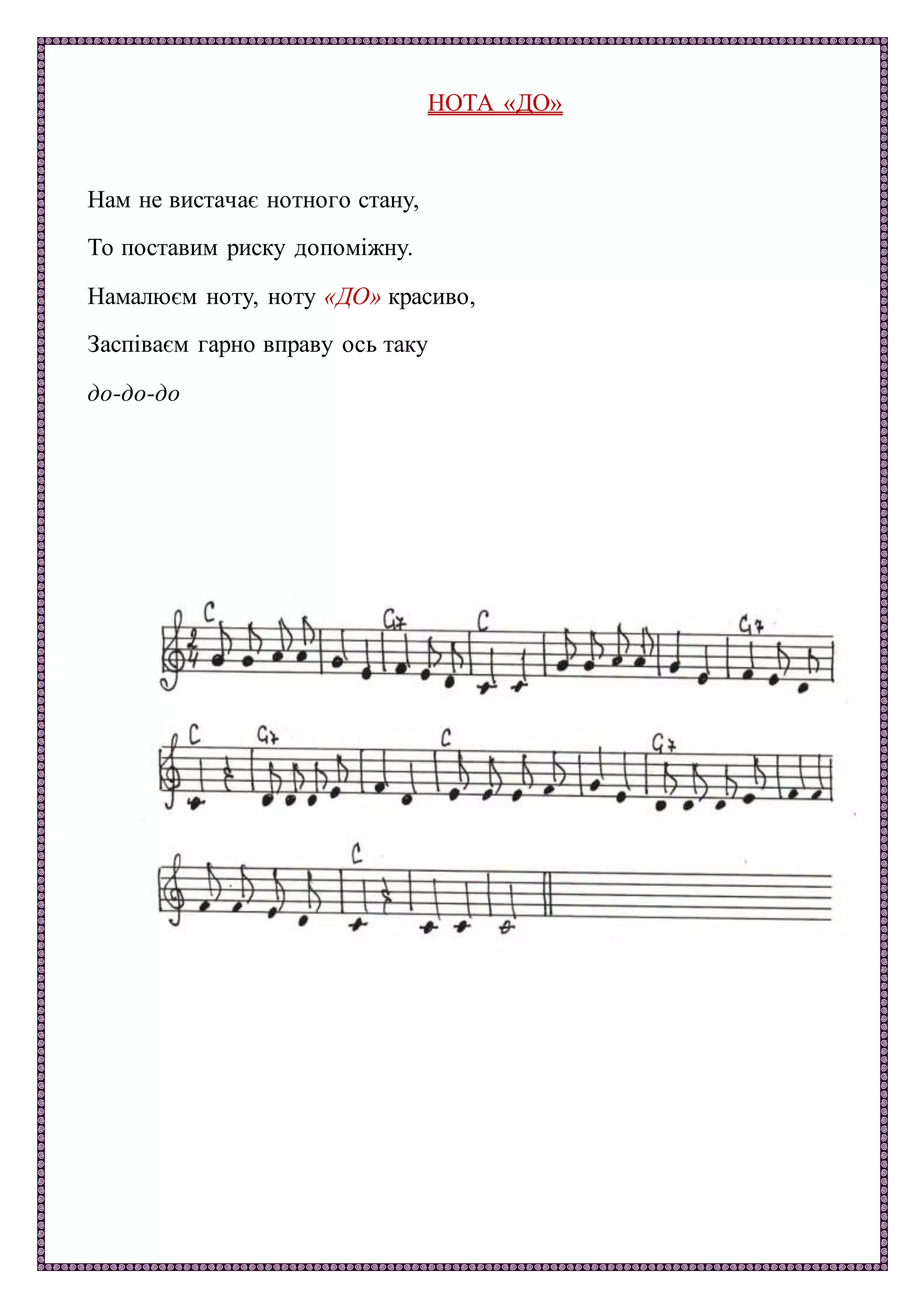 вистачає нотного стану, То поставим риску допоміжну. Намалюєм ноту, ноту «ДО» красиво, Заспіваєм гарно вправу ось таку до-до-до