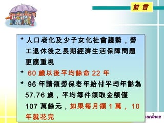 本文件介绍了劳保年金制度,包括年金给付的申请与核发原则、不同类型的年金(老年年金、失能年金及遗属年金)以及其标准和计算方式。同时,讨论了人口老龄化带来的退休后经济保障问题,并强调年金制度的安全性和持续性。最终,提供了针对不同保单持有人和其家属的生活保障解决方案。