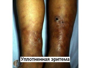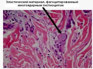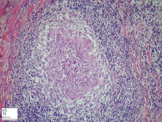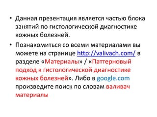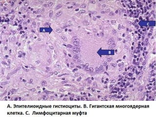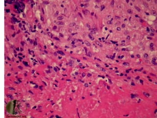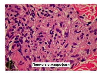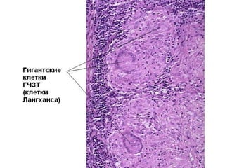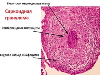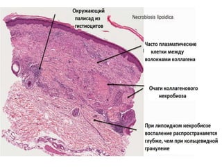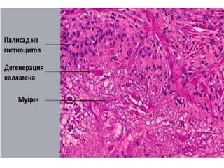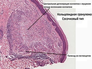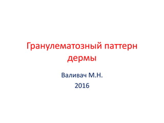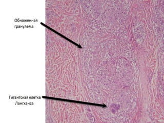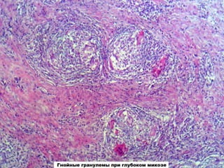Документ представляет собой презентацию о гранулематозном паттерне дермы, рассматривающую основные виды гранулем, их механизмы образования и гистологические особенности. Гранулемы могут быть вызваны различными заболеваниями кожи, такими как туберкулез, лепра и саркоидоз, каждая из которых имеет свои отличительные признаки и гистологические характеристики. В заключение, документ подчеркивает важность гистологической диагностики для правильного определения типа гранулем и соответствующего лечения.