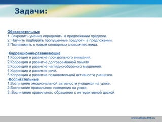 Документ описывает урок русского языка для 4 класса в школе №499 Санкт-Петербурга, в котором основное внимание уделяется определению и подбору предлогов в предложениях. Урок включает образовательные, коррекционно-развивающие и воспитательные задачи, такие как развитие внимания, долговременной памяти и правильного поведения на уроке. Ученикам предлагается практика составления предложений с пропущенными предлогами и работа с новым словарным словом 'лестница'.