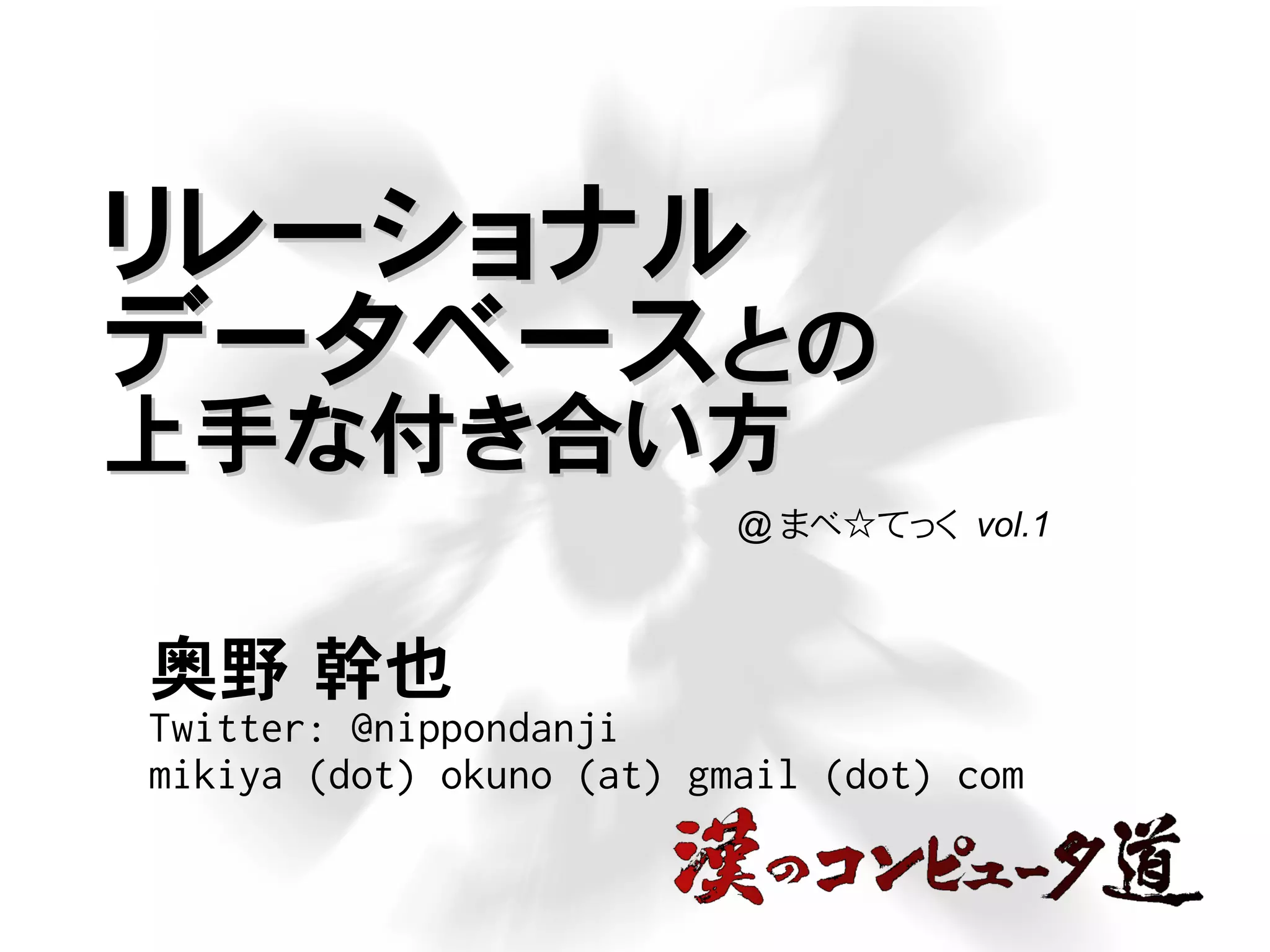 まべ☆てっく Vol.1にて発表したスライドです。リレーショナルデータベースをどのように使うべきか、あるいはそもそも何故データベースを使うべきなのかといったことについて解説しています。