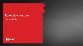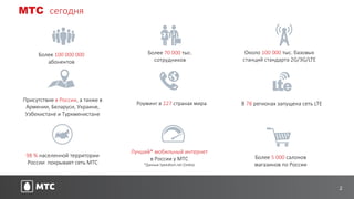 Документ описывает трансформацию бизнеса компании МТС, включая её крупные показатели, такие как 70 000 сотрудников и более 100 000 000 абонентов. Акцентируется внимание на внедрении технологий LTE и развитии экосистемы МТС, а также на изменении подхода к маркетингу и клиентскому обслуживанию. МТС активно развивает новые предложения для B2B-сектора, улучшая взаимодействие с клиентами и удовлетворяя их реальные потребности.