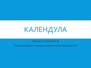 Документ описывает календулу (ноготки), род травянистых растений, произрастающий в средиземноморье и известных своими лекарственными свойствами. Цветки ноготков применяются в медицине для лечения различных заболеваний, а также находят использование в косметологии и цветоводстве благодаря своему яркому виду и длительному цветению. В документе также приведены ботанические характеристики и распространение календулы.