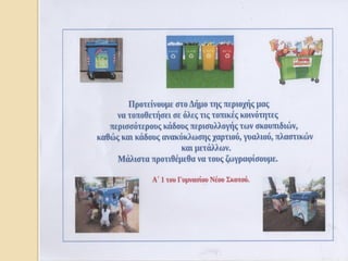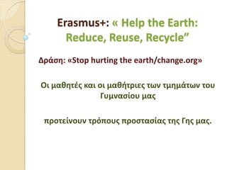 Στα πλαίσια του προγράμματος Erasmus+, “ Help the Earth: Reduce, Reuse, Recycle.” και της Δράσης “Stop hurting the earth/change.org”, το κάθε τμήμα του σχολείου μας,του Γυμνασίου Νέου Σκοπού, προτείνει έναν εφικτό τρόπο προστασίας της γης μας.