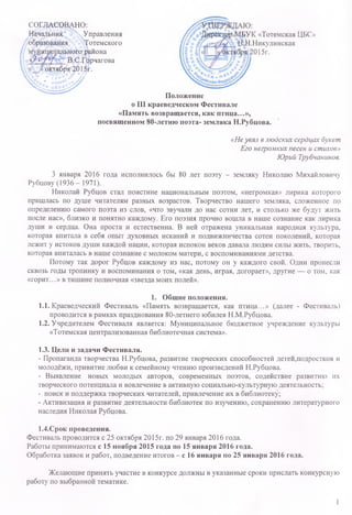Документ содержит положение о III краеведческом фестивале «Память возвращается, как птица...», посвященном 80-летию поэта Николая Рубцова, который пройдет с 25 октября 2015 года по 29 января 2016 года. Фестиваль направлен на пропаганду творчества Рубцова, развитие творческих способностей молодежи и активизацию работы библиотек по сохранению его литературного наследия. Участники могут заявлять свои работы в разных номинациях, включая конкурса поэтов и исследовательские работы, а также получат возможность поддержать и развивать культурное наследие региона.