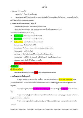 สมิธ สมิธ สมิธ สมิธ สมิธ สมิธ สมิธ สมิธ สมิธ สมิธ สมิธ สมิธ สมิธ สมิธ สมิธ สมิธ สมิธ สมิธ สมิธ สมิธ สมิธ สมิธ บทที่ 1 ความหมาย มีสองแบบคือ - ตามคาศัพท์= ผู้ชี้ทาง ผู้นาทางผู้บอกทาง *** - ตามกฏหมาย = ผู้ให้บริการเป็นปกติธุระในการนานักท่องเที่ยวไปยังสถานที่ต่างๆ โดยใหคาแนะนาและความรู้ (ถ้าพาไป แต่ไม่ให้ความรู้เรียก Transfer man/personnel) ความแตกต่างระหว่างมัคคุเทศก์ และหัวหน้าทัวร์ - มัคคุเทศก์มีหน้าที่หลักๆคือ ให้ขอมูลความรู้แก่นักท่องเที่ยว - หัวหน้าทัวร์มีหน้าที่หลักๆคือ ดูแล, รับผิดชอบนักท่องเที่ยว ตั้งแต่เริ่มจนจบ ตลอด24ชั่วโมง การแบ่งมัคคุเทศน์ตามลักษณะงาน แบ่งใหญ่ๆ ** Domestic Guide = นาคนในประเทศ เที่ยวในประเทศ ** Inbound Guide = นาคนนอกประเทศ เที่ยวในประเทศ ** Outbound Guide = นาคนในประเทศ เที่ยวนอกประเทศ Freelance Guide = ไกด์อิสระไปไหนก็ได้ On site Guide. = ไกด์ที่ประจาตามแหล่งท่องเที่ยวเช่น ปราสาท อุทยาน ฯลฯ Museum guide. = ไกด์ในพิพิธภัณฑ์ City Guide = นาเที่ยวในเมืองใหญ่ๆ ให้ความรู้เกี่ยวกับจุดสาคัญๆของเมือง Transfer Guide = คนที่ไปรับ- ส่งนักท่องเที่ยว แล้วให้คาแนะนา/ข้อมูลเบื้องต้นระหว่างทาง Sightseeing guide = นาเที่ยวไฮไลท์ จุดต่างๆของเมือง ** Sitting Guide = ไกด์ผี เป็นไม้กันตารวจให้หัวหน้าทัวร์ชาวต่างชาติที่ไม่ต้องการจ้างไกด์แพงๆ (ต้องมีบัตรไกด์) (ต้องมีบัตรหัวหน้าทัวร์) ******************* ไกด์เป็นอาชีพสงวนในประเทศไทย**************** ความเป็นมาของอาชีพมัคคุเทศก์ ปฏิวัติอุตสาหกรรม >>> คน(รวย)มีเวลามากขึ้น = คน(รวย)มีเวลาไปเที่ยว >>> โธมัส คุ้ก (Thomas cook) เลยจัด โปรแกรมเที่ยวทางรถไฟในอังกฤษ โดยมีไกด์ที่ได้รับการฝึกอบรมมา จึงจัดว่า โธมัสเป็นผู้บุกเบิกและสร้างมาตรฐานของอาชีพ มัคคุเทศก์ พระบิดาของมัคคุเทศก์ไทย คือ สมเด็จกรมพระยาดารงรานุภาพ และเอาวันประสูติ ที 21 มิถุนายน เป็นวันมัคคุเทศก์ ไทย - ปี 2535 มีพระราชบัญญัติธุรกิจนาเที่ยวและมัคคุเทศก์ใจความคือ มัคคุเทศก์จะต้องมีใบอนุญาต และตรงตามข้อกาหนด (อายุไม่ต่ากว่า20 ผ่านการอบรม ฯลฯ) - ปี 2551 ออกพรบ. ธุรกิจนาเที่ยวและมัคคุเทศก์ฉบับใหม่ ให้มัคคุเทศก์อยู่ใต้การดูแล ของกรมการท่องเที่ยว (จากเดิม ททท.ดูแล)
