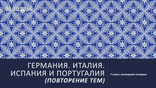 Документ представляет собой тест по всемирной истории для 7 класса, посвященный экономическим и политическим особенностям Германии, Италии, Испании и Португалии в позднем средневековье. Вопросы охватывают темы, такие как спрос на товары, городские объединения, власть и развитие ремесел и торговли. Документ также включает задания на заполнение пробелов и определение ключевых исторических событий и характеристик региона.