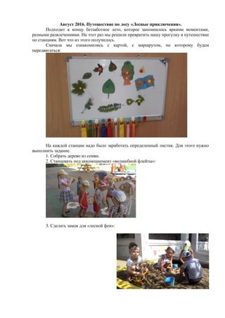 Документ описывает летнее путешествие по лесу, организованное в формате станционного маршрута с заданиями. Участники собирали листики, выполняя различные творческие и образовательные задания, такие как сбор семян, танцы и создание поделок. В итоге, это мероприятие стало насыщенным и интересным опытом, позволяющим детям узнать больше о деревьях и природе.