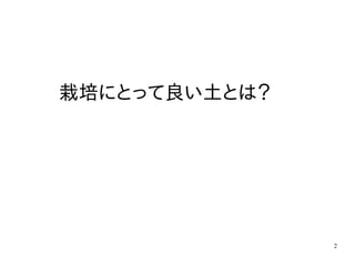 まとめ ・畑に腐植を入れて、より大きく育てる環境を目指す ・カルシウムの過剰施肥を避けることで、全ての肥料要素の 吸収効率を高め、作物を健康的にする ・特定の菌だけが増殖できる環境を避ける 病気の発症率を下げることで、農薬の散布量は減らせる