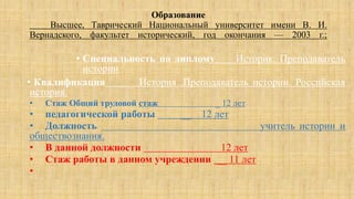 Татьяна Николаевна Ракович - учитель истории и обществознания с высшим образованием и 12-летним стажем работы. Она окончила Таврический национальный университет в 2003 году и прошла несколько курсов повышения квалификации. В настоящее время она работает в образовательном учреждении на протяжении 11 лет.