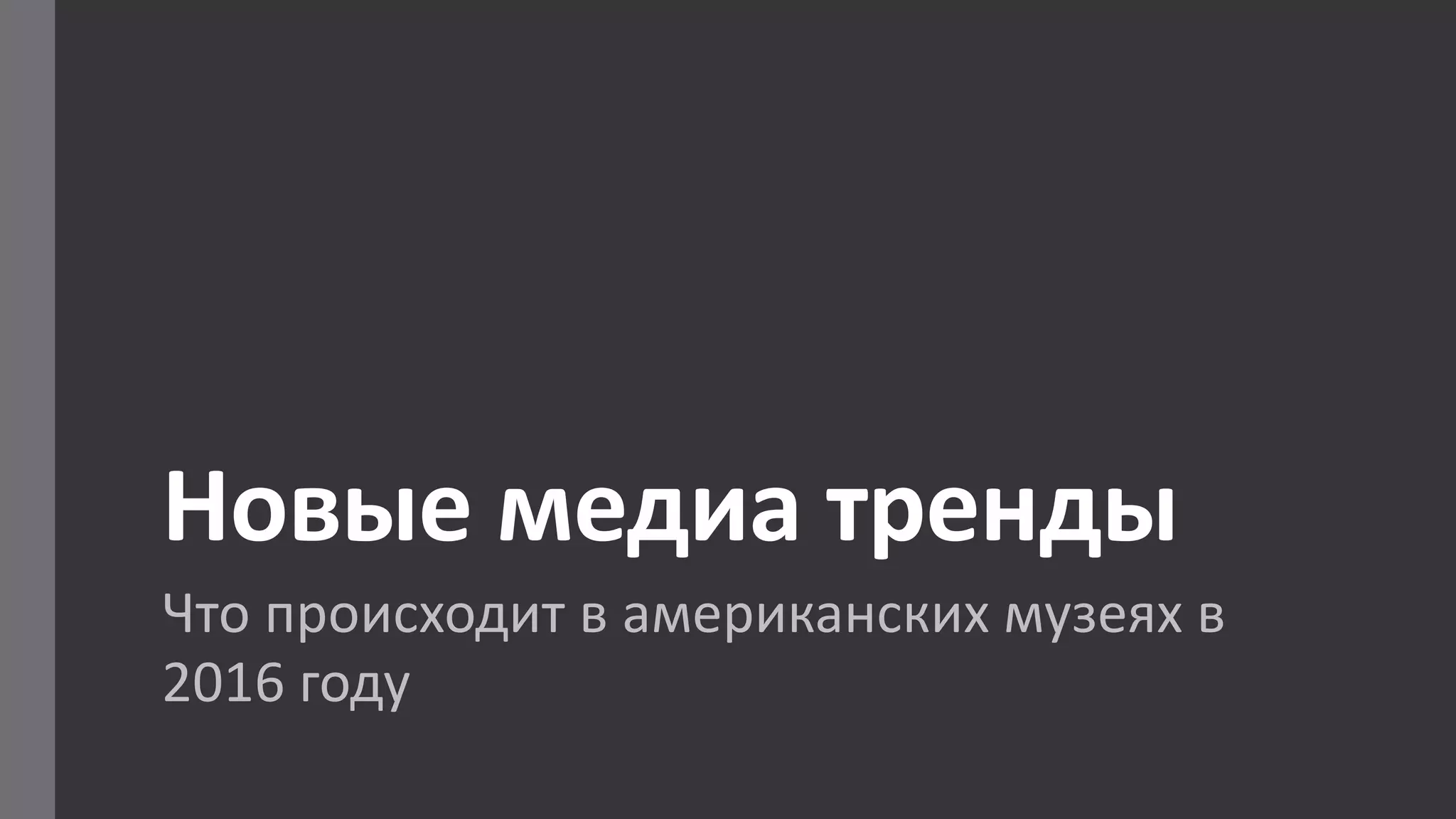 Документ рассматривает новые медиа-тренды в американских музеях на 2016 год, включая развитие 360-градусного и 3D-видео, навигацию внутри помещений с использованием геолокации и влияние социальных сетей на взаимодействие между музейными работниками и посетителями. Также обсуждаются инициативы, возникающие снизу, которые помогают формировать партнерства и популяризировать важные социальные темы. В заключение, подчеркивается необходимость цифровой грамотности и адаптации музейных сотрудников к новым технологиям для повышения эффективности их работы.