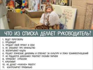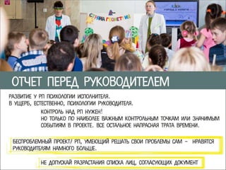 Документ содержит ссылки на различные статьи и блоги, посвященные управлению проектами, людьми и самоорганизацией. Темы включают мотивацию команды, управление временем менеджера и юмор в проектном управлении. Эти ресурсы предлагают полезные советы и уроки для менеджеров проектов.