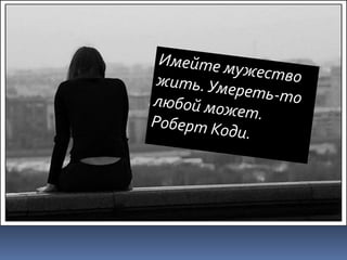 Документ рассматривает проблему суицидов среди молодежи, подчеркивая причины, такие как личные конфликты, давление со стороны общества и острые эмоциональные переживания. Описываются меры помощи при потенциальном суициде, а также развенчиваются мифы о суицидах, подчеркивающие важность понимания этих проблем. В заключение предлагается социальный ролик, который акцентирует внимание на ценности жизни.