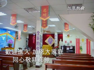 加恩教會致力于同心敬拜真神,提供崇拜注意事项以确保崇拜氛围。文档中提到基督教信仰的核心,强调每个人在耶稣基督内成为新造的人。歌词提及希望、信仰及福音的重要性,呼吁信徒共同传扬福音。
