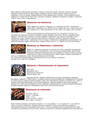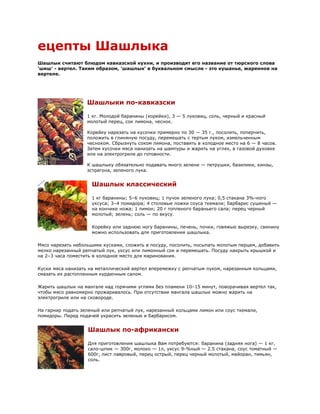 Документ описывает различные рецепты шашлыка, его историю и ключевые ингредиенты. Приводятся разные варианты шашлыка, включая традиционный кавказский, африканский и пекинский, с указанием необходимых продуктов и способов приготовления. Также упомянуты рецепты соусов и котлет, которые могут сопровождать шашлык.