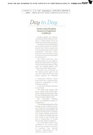 An Israeli study found that elderly people who used reading glasses consistently performed better on cognitive tests than those who did not use visual aids. The study of 190 people aged 75-91 showed those using reading glasses scored better, and the researcher notes reading glasses are inexpensive versus surgery or expenses. The connection between vision and cognition is still being explored, but one explanation is that elderly people with poor vision engage in less mental and physical activity due to inability to see well.