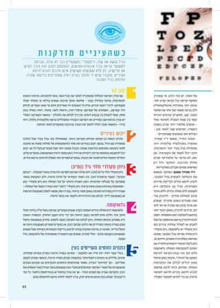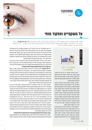 ק ד ז מ ם י י נ י ע ה ש כ עברתם ,עולה לא כבר במשקפיים ”ה”מספר .שלו את עושה הגיל לחדש צורך ואין לנהוג הפסקתם ,ארבעים-חמישים בגיל קריאה למשקפי לרופא להגיע מרבים אינם קשישים שאנשים פלא לא .הרישיון את שגרה בדיקות שמצריכות ראיה בעיות והותר די שיש מתברר .העיניים המבוגר בגיל ואיבחון קטרקט הופכת והראיה ,להתכהות נוטה ,האור קרני את למקד שתפקידה הצלולה העדשה ,הגיל עם יסבלו ומעלה 75 בגילאי אנשים ארבעה מתוך שלושה - טבעי בתהליך מדובר .למעורפלת לכולם ,ועשרים מאה עד ימים מאריכים היו האנשים כל אילו ,עיניים רופאי לדברי .מקטרקט בעין כפולה ראיה ,סינוור ,לאור רגישות ,ראיה ערפול :קטרקט של תסמינים ...קטרקט היה ”“בשל הקטרקט וכאשר - התהליך את לבלום דרך אין .דומים צבעים בין להבחין קושי ,אחת רווח .צלולה מלאכותית עדשה ומשתילים העכורה העדשה את מסירים שבו בניתוח צורך יש .הניתוח לאחר משקפיים בהרכבת הצורך את לחסוך יכולה טובה התאמה - צדדי בעיניים יובש הולכת אבל צעיר בגיל כבר שמתחילה ,ביותר ומציקה שכיחה תופעה הן יבשות עיניים תופעת או שונות מחלות של הסימפטומים אחד הוא בעיניים יובש ,בנוסף .הגיל עם ומחמירה יובש .65 גיל מעל מבוגרים אצל יותר נפוצה הבעיה .שונות בתרופות משימוש כתוצאה לוואי ,קליםבמקרים.מטושטשתוראיהמוגברדמע,גירויאודקירות,צריבהבתחושתלהתבטאיכול .עינייםברופאלהיוועץמומלץיותרחמוריםבמקרים,הבעיהאתלפתוריכוליםדמעותתחליפי )(נמ”ג גיל תלוי מקולרי ניוון “הכתם-המקולהבאזורהדרגתיתלפגיעההגורמתמחלההינוAMD((גילתלוימקולריניוון באזור התנוונות ולכן ,הראיה חדות על האחראי האזור זהו .העין ברשתית המצוי ,”הצהוב יבש מקולרי ניוון הוא המחלה של קל והיותר השכיח הסוג .יומיומיות פעולות על משפיעה -המחלהשלהקשההצורההוא”“רטובמקולריניוון.בראיהפחותופוגעבאיטיותשמתפתח- תרופותבאמצעותלטפלאפשררטובבנמ”ג.בראיהחמורבאופןופוגעתבמהירותשמידרדרת .הראיה כושר את ולשמר ההידרדרות את לבלום ,לייזר באמצעות או גלאוקומה הנוזלבלחץעליהבשלונגרמת,מבוגריםאנשיםבקרבהנפוצהעינייםמחלתהיאגלאוקומה הטובה הבשורה .ועיוורון העצב הרס כדי ועד הראיה בעצב לפגיעה גורם הלחץ .עיני התוך טיפול באמצעות עיוורון ולמנוע בעצב הפגיעה את לבלום ניתן ,המחלה איבחון שמרגע היא אוניתוחבאמצעותחמוריםבמקריםאו,העיןשבתוךהלחץאתהמורידיםטיפותבצורתמונע אנשיםאצלבמיוחדתקופתיותבדיקותלביצועגבוההחשיבותנודעת,זומסיבה.בלייזרטיפול וגיל ,גלאוקומה של משפחתית היסטוריה עם אנשים ,סוכרת חולי - סיכון בקבוצת שנמצאים .מבוגר בעין משייטים וחוטים כתמים ,שחורות נקודות בצורת הראיה בשדה הפרעה - התופעה את מייד יזהו ראיה קוצר בעלי לעקוב מנסים וכאשר ,הראיה בשדה שונים במקומות ”ה”משייטים כתמים או סלילים ,חוטים נובעים )זבובים גם (הנקראים והחוטים שהכתמים מאחר .הצידה ”“בורחים הם - אחריהם אתהממלאהזגוגיהנוזלבתוךונמצאיםהעיןמקירהמתקלפיםהפרשהחומרישלמהצטברות עוד כל .כלשהי בהתייחסות או בטיפול צורך אין אך - והגיל השנים עם גוברת ההפרעה ,העין .מהם ולהתעלם איתם לחיות ללמוד צריך ,לנזק גורמים ואינם בעין שטים ”ה”זבובים שמרכיב מי ,היגיון בזה יש .המוח של ,יותר קורא הנראה ככל קריאה משקפי אינטלקטואלית בפעילות יותר עוסק תפקוד את יותר טוב משמר כנראה ולכן הוכיחו קודמים מחקרים ,אגב .המוח מוחי לשימור השכלה שנות בין קשר בשנות שנים יותר שלמדו אנשים - - מכן לאחר שנה חמישים ,העשרה .”קוגניטיביים במבחנים יותר הצליחו ,שפירר ד”ר מאשר ,החרדי המגזר יותר שלומדת באוכלוסיה מאופיין ,תיאורטית .יותר צעיר בגיל ומתחילה עם .הקוגניציה את לשמר יכול הדבר שהיא אלצהיימר על מדובר לא ,זאת רק כלל המחקר ,מורכבת מחלה .מאלצהיימר סובלים שאינם קשישים מאשש המחקר :מסכם שפירר ד”ר ,המבוגר בגיל לאנשים ההמלצה את סדירות לבדיקות עיניים לרופא להגיע היא ההמלצה ,65 מגיל .ושגרתיות גורמי וללא עיניים מחלת ללא לאנשים מדי להיבדק - עיניים למחלות סיכון אנשי
