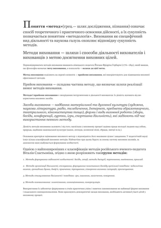 Поняття «метод»(грец.— шляхдослідження, пізнання) означає спосіб теоретичного і практичного освоєння дійсності, а їх сукупність позначається поняттям «методологія». Виховання як специфічний вид діяльності та наукова галузь охоплює відповідну сукупність методів.<br />Методи виховання — шляхи і способи діяльності вихователів і вихованців з метою досягнення виховних цілей.<br />Першовідкривачем методів виховання вважають німецького педагога Йогана-Фрідріха Гербарта (1776—1841), який вважав, що філософія визначає мету виховання, а психологія — шляхи до цієї мети.<br />Метод виховання поділяють на окремі елементи — прийоми виховання, які використовують для підвищення виховної ефективності методів.<br />Прийом виховання — складова частина методу, що визначає шляхи реалізації вимог методів виховання.<br />Методи і прийоми виховання є своєрідними інструментами в діяльності вихователя. їх дієвість залежить від використання виховних засобів.<br />Засоби виховання — надбання матеріальної та духовної культури (художня, наукова література, радіо, телебачення, Інтернет, предмети образотворчого, театрального, кіномистецтва тощо), форми і види виховної роботи (збори, бесіди, конференції, гуртки, ігри, спортивна діяльність), які задіюють під час використання певного методу.<br />Дієвість методів виховання залежить і від того, наскільки у виховному процесі задіяна праця молодої людини над собою, природа, надбання національної культури (казки, легенди, колискові пісні, обряди, звичаї та ін.).<br />Основним критерієм оцінювання виховного методу є відповідність його виховним цілям і завданням. У педагогічній науці існує кілька класифікацій виховних методів. Найчастіше при цьому беруть за основу систему виховних впливів, за допомогою яких відбувається формування особистості.<br />Однією з найпоширеніших є класифікація методів російського вченого-педагога Віталія Сластьоніна, згідно з якою розрізняють такігрупи методів:<br />1. Методи формування свідомості особистості: бесіди, лекції, методи дискусії, переконання, навіювання, приклад.<br />2. Методи організації діяльності, спілкування, формування позитивного досвіду суспільної поведінки: педагогічна вимога, громадська думка, довір'я, привчання, тренування, створення виховних ситуацій, прогнозування.<br />3. Методи стимулювання діяльності і поведінки: гра, змагання, заохочення, покарання.<br />4. Методи самовиховання: самопізнання, самооцінювання, саморегуляція.<br />Використання їх забезпечує формування в учнів практичних умінь і навичок самовиховання як найвищої форми виховання і подальшого самовдосконалення. Вони враховують демократичні засади виховання, необхідність активної участі дітей у виховному процесі.<br />