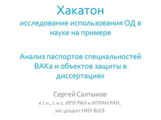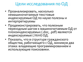 Документ исследует применение открытых данных (ОД) в науке, анализируя паспорта специальностей ВАК и диссертации. Основной целью является демонстрация полезности индексируемых текстовых данных для гражданского общества и выделение преимуществ 'гуглочитаемых' данных, которые доступны без навыков программирования. В результате исследования предполагается создание единой открытой информационной системы для улучшения доступа к научной информации.