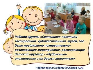 Дети группы 'Солнышко' посетили Таганрогский художественный музей для участия в мероприятии 'Художники-анималисты и их друзья животные', организованном педагогом Ю.А. Ляльцевой. Они изучили удивительные полотна с изображением животных, а также активно участвовали в занятии с настоящей собакой и создали картины из пластилина. В дополнение к этому, дети посетили выставку бабочек и экзотических насекомых 'Тропический рай'.