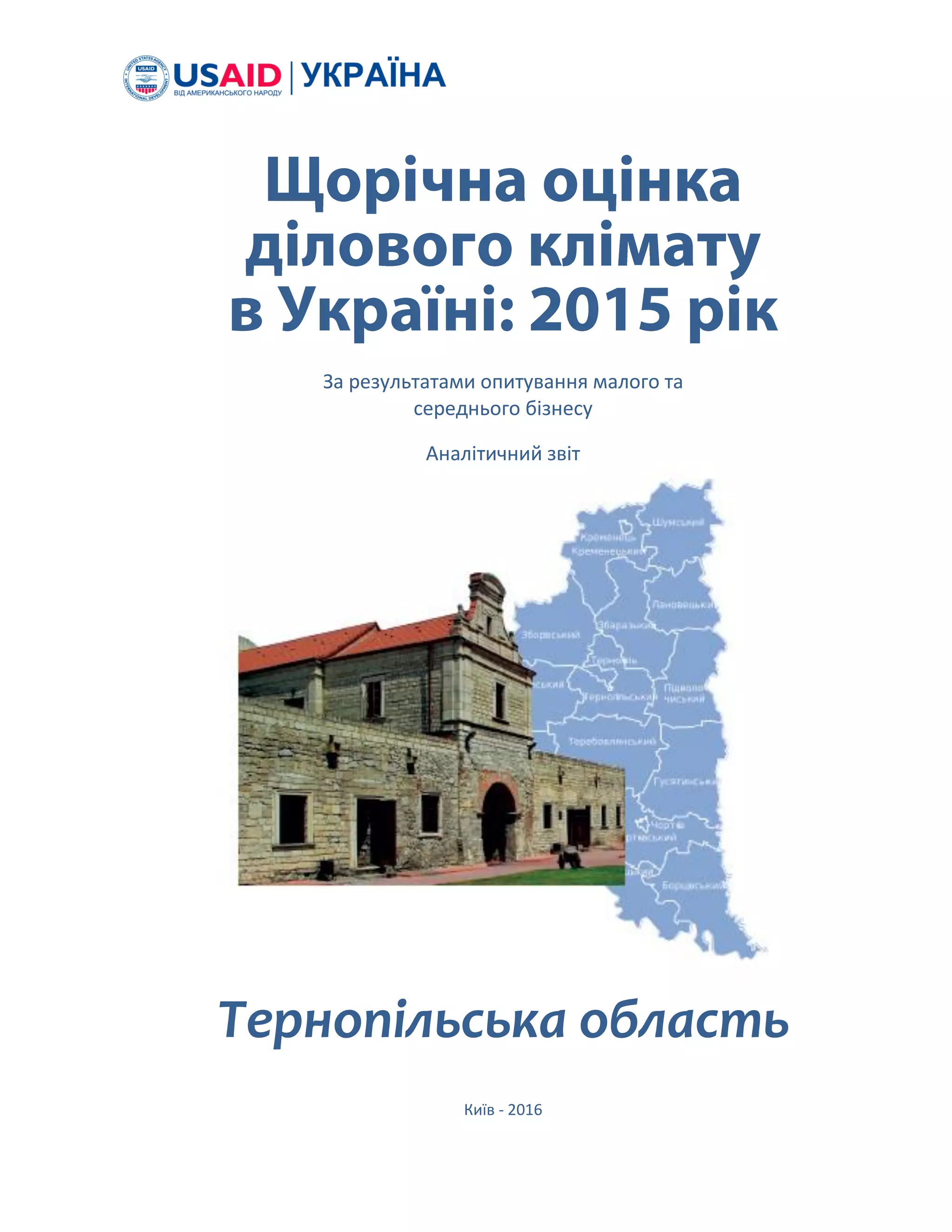 Тернопільська область є одним із пілотних регіонів Програми USAID ЛЕВ. У 2015 році 75 малих та середніх підприємств Тернопільської області стали учасниками опитування "Щорічна оцінка ділового клімату в Україні". Загалом було опитано більш, ніж 1800 МСП у 25 регіонах України. У цьому звіті, який ми підготували спеціально для Тернопільської області, ми порівнюємо результати опитування МСП в Тернопільській області та в Україні в цілому.