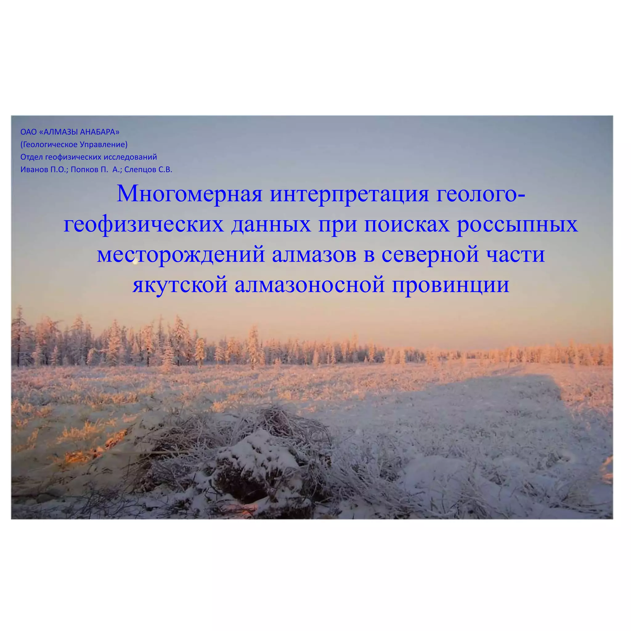 Документ описывает многомерную интерпретацию геологогеиофизических данных для поиска россыпных алмазов в Якутии, с акцентом на применение геофизических методов для выявления аллювиальных и эрозионно-карстовых россыпей. Проведенные исследования включают анализ магнитного поля и геоэлектрические разрезы, что позволяет улучшить прогнозирование зон с высоким содержанием алмазов. Основные результаты показывают эффективность комплексного подхода к использованию геолого-геофизических данных в поиске алмазов.