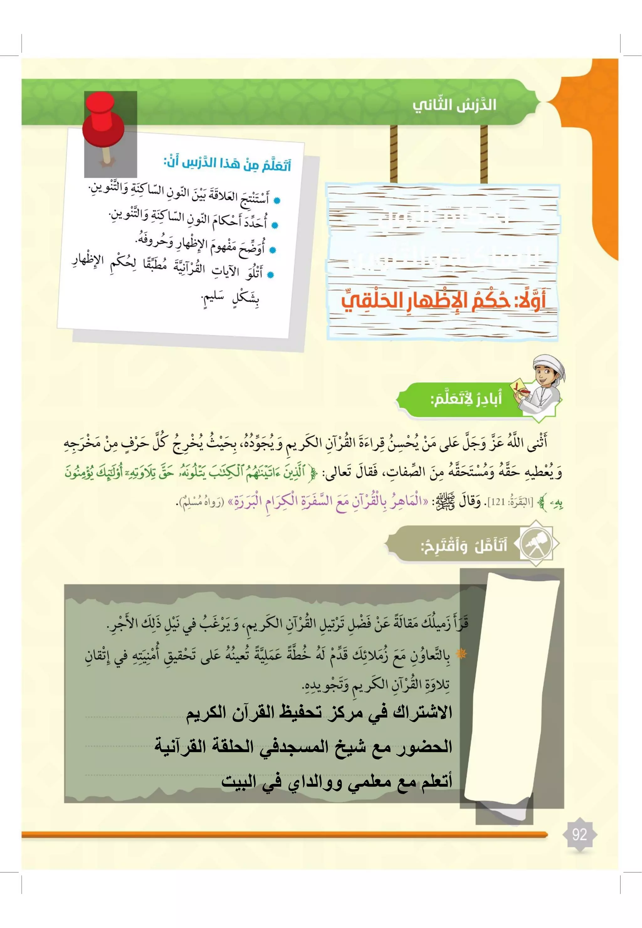 تتناول الوثيقة كيفية تحفيظ القرآن وتعلم النطق الصحيح للحروف والكلمات، موضحة بعض القواعد الأساسية مثل الإظهار والإدغام والإخفاء. تُبرز أيضًا أهمية اتباع الأصول الصحيحة أثناء التعلم وتعلم مخارج الحروف. تحث الوثيقة على الالتزام في الأساليب التعليمية لتحقيق فهم أفضل للقرآن.