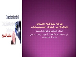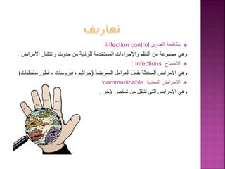يتناول المستند إجراءات مكافحة العدوى في المستشفيات ويشمل أساليب الوقاية من الأمراض المعدية، ويدرب العاملين الصحيين على الالتزام بمعايير النظافة والعزل. كما يقدم معلومات حول أهمية مراقبة العدوى وتقديم الرعاية الصحية للمرضى لتجنب العدوى المكتسبة أثناء الإقامة في المنشآت الصحية. يتم التأكيد على الحاجة إلى السياسات والتقنيات الحديثة لمواجهة تحديات انتشار العدوى وضمان جودة الخدمات الصحية.