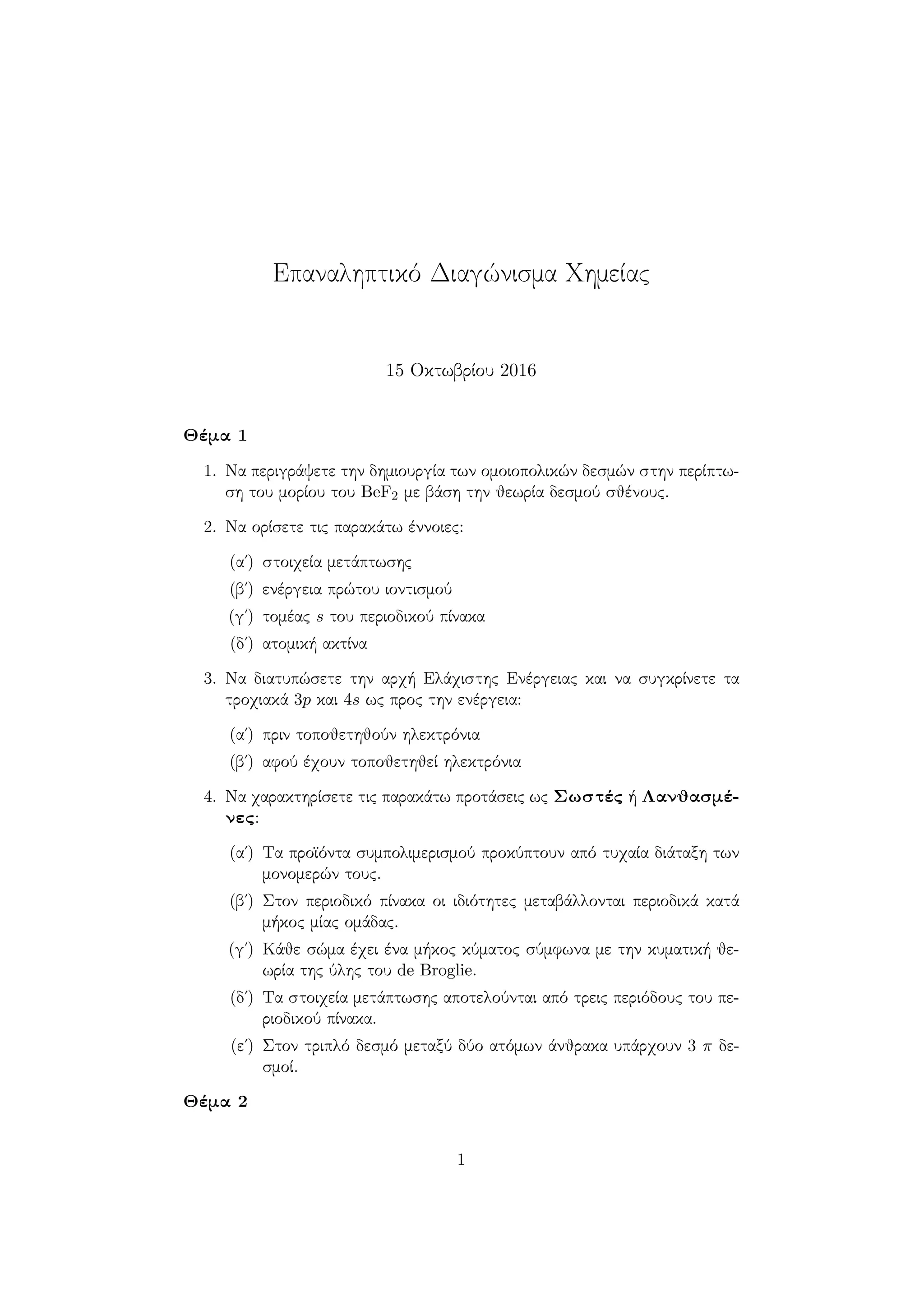 Ένα επαναληπτικό διαγώνισμα στα κεφάλαια της ηλεκτρονιακή δόμησης των ατόμων (κατανομή ηλεκτρονίων, περιοδικές ιδιότηες και περιοδικός πίνακας) και της οργανικής χημεία μέχρι και τις αντιδράσεις πολυμερισμού (περιλαμβάνεται ένα εκτενές δεντράκι).