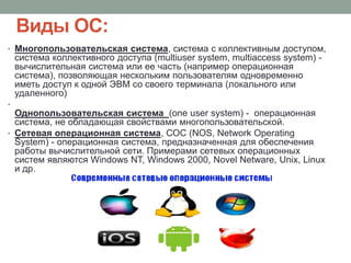 Презентация операционных систем включает краткое описание различных видов ОС, таких как многопользовательские и однопользовательские системы, а также сетевые операционные системы. Рассуждается о семействах ОС Microsoft Windows и Apple Mac OS, их разработке и популяризации. Документ также затрагивает операционные системы Android и Linux, описывая их особенности и развитие.