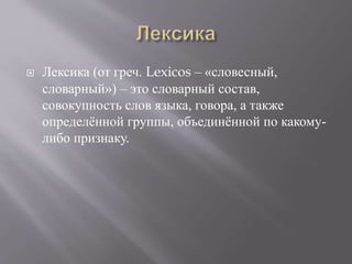 Документ охватывает темы лексики, включая определение словарного состава языка и классификацию слов по различным критериям, таким как профессии, качества людей и транспортные средства. Обсуждаются лексические и грамматические особенности слов, а также различные языковые явления, такие как синонимы, антонимы, омонимы и неологизмы. Также рассматриваются методы определения значений слов и их происхождение, включая этимологию и диалектические особенности.