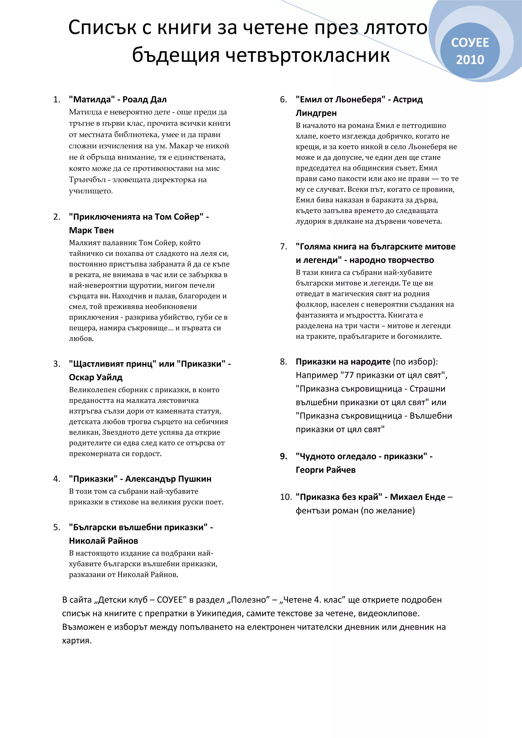 - Михаел Енде – фентъзи роман (по желание)<br />В сайта „Детски клуб – СОУЕЕ” в раздел „Полезно” – „Четене 4. клас” ще откриете подробен списък на книгите с препратки в Уикипедия, самите текстове за четене, видеоклипове. Възможен е изборът между попълването на електронен читателски дневник или дневник на хартия. <br />