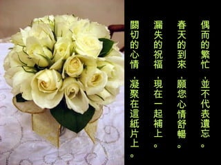 偶而的繁忙,並不代表遺忘。 春天的到來,願您心情舒暢。 漏失的祝福,現在一起補上。