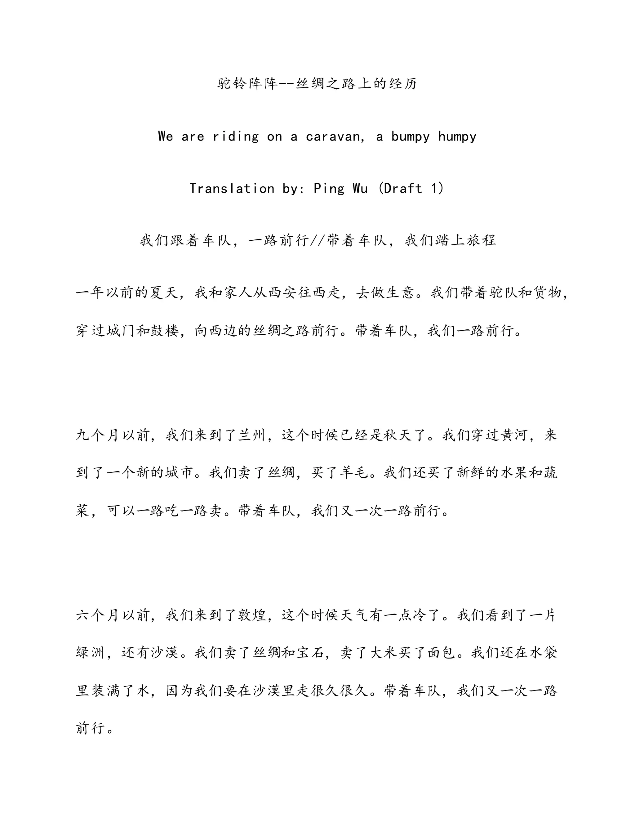 本文讲述了一家人在丝绸之路上旅行的经历,描述了他们的行程从西安出发,途经兰州、敦煌、哈密、吐鲁番,最终到达喀什。旅行过程中,他们不仅卖丝绸和购买商品,还体验了不同的季节和地理环境。最终,他们参加了喀什的集市,完成了交易,准备返回西安。