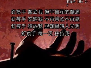 安慰我 不再害怕不再憂 釘痕手 釋放我 脫離黑暗入光明 釘痕手 每一天 扶持我 釘痕手(華)2- 2
