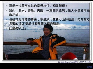 这篇文档描述了华裔女性Eva Mai在2006年到2007年间的南极之旅,记录了她的航海体验、自然观察以及与当地动物的互动。旅途中,她参与了帆船操作、学习生物知识,并在南极美丽的冰川和企鹅群中感受到了人与自然的和谐。旅程展现了南极的奇观和挑战,令人难忘。