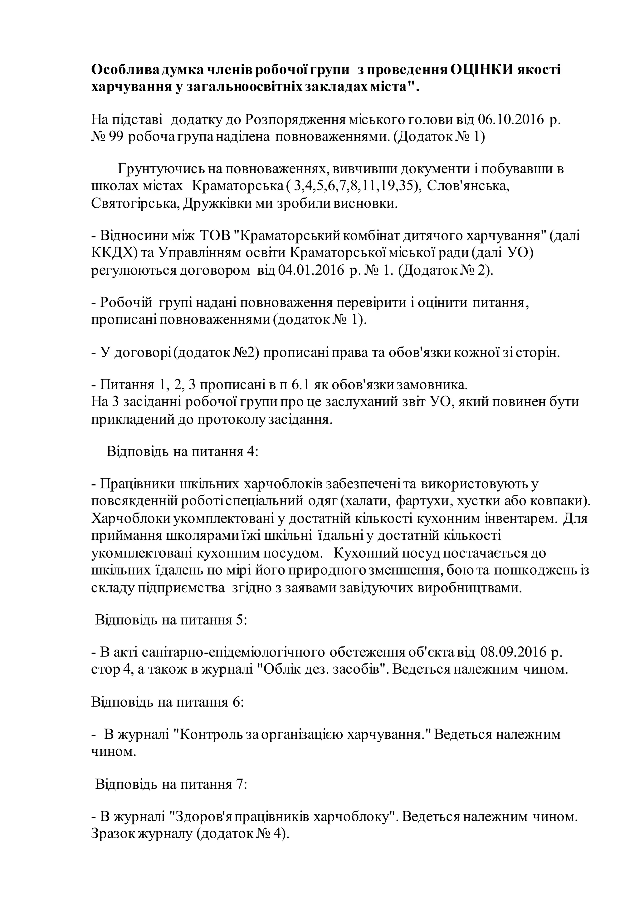 Особлива думка членів робочої групи з проведення оцінки якості харчування у загальноосвітніх закладах міста
